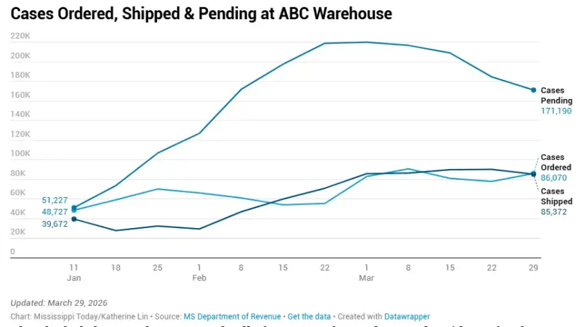 While some stores and restaurants report that they’re receiving more shipments and the warehouse has ramped up the number of cases it’s sending out, there was still a backlog of 170,000 cases as of March 29, according to the Department of Revenue’s website.
