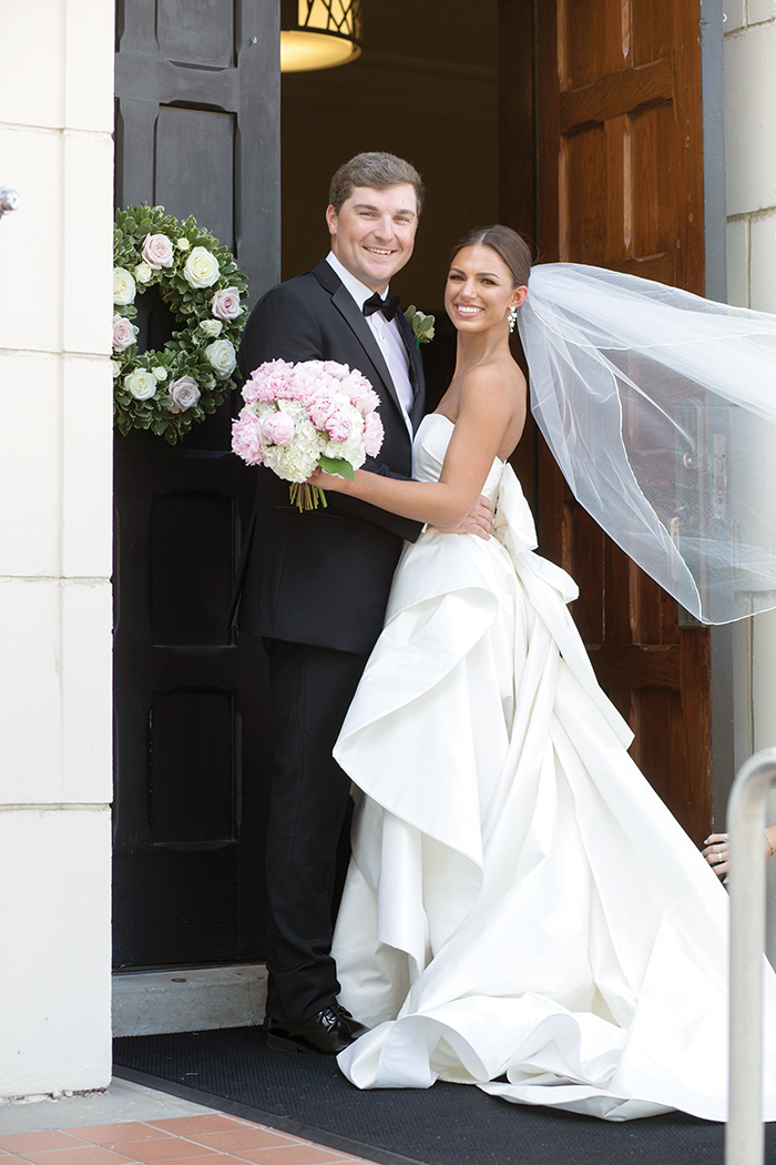Maid of honor was the bride’s cousin, Emme Aldridge. Bridesmaids were Macey Lovertich, Blair Amberson, Ally Brumfield, Julia Farley Collins, Mary Rogers Coon, Katherine Greer, Carlysle Harkins, Emerson Harkins, Andi Herring, Harper Laird, Anna Kathryn McDaniel, Hanisee Sirmon, Lilly Shelton, and Abby Wright. Junior bridesmaid was Crews Carter.