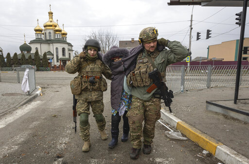 Ukrainian soldiers carry civilians away from Russian attacks. Others who couldn't be saved from the barrage lie dead in the street.