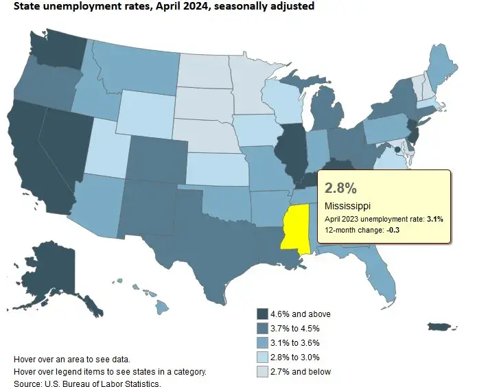 The current unemployment rate for Mississippi (as of April 2024) stands at 2.8 percent.