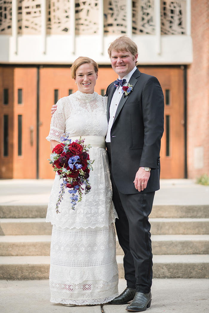 Given in marriage by her parents and escorted by her father, the bride wore her great grandmother’s heirloom ivory and white cotton lace dress with applique’ embroidery from the early 1900s. The bride’s mother added seed pearls to the lace and wore the dress for her own wedding. The high neckline, keyhole open back and wide satin ribbon at the waist, added by her mother, completed the gown’s look. Her bouquet featured large black magic red roses, blue delphinium, light blue snapdragons, and greenery wrapped with ivory satin ribbons.
