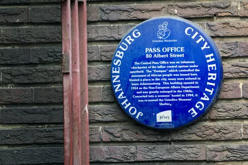 Without a pass from the apartheid government to work there, people were "denied a place" in Johannesburg, the inscription reads.