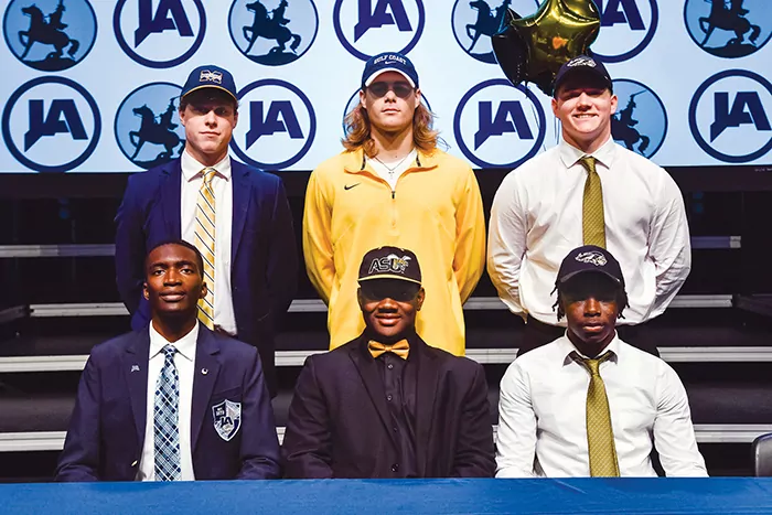 Six Jackson Academy students signed commitments to colleges and universities. The students, who will receive scholarships, include (from left, back) Joseph Ciaccio, baseball, Tate Collins, football, both, Mississippi Gulf Coast Community College; Max Walenta, football, East Central Community College; (front) Kendrick Davis, band, William Carey University; Marcus Harris, football,…