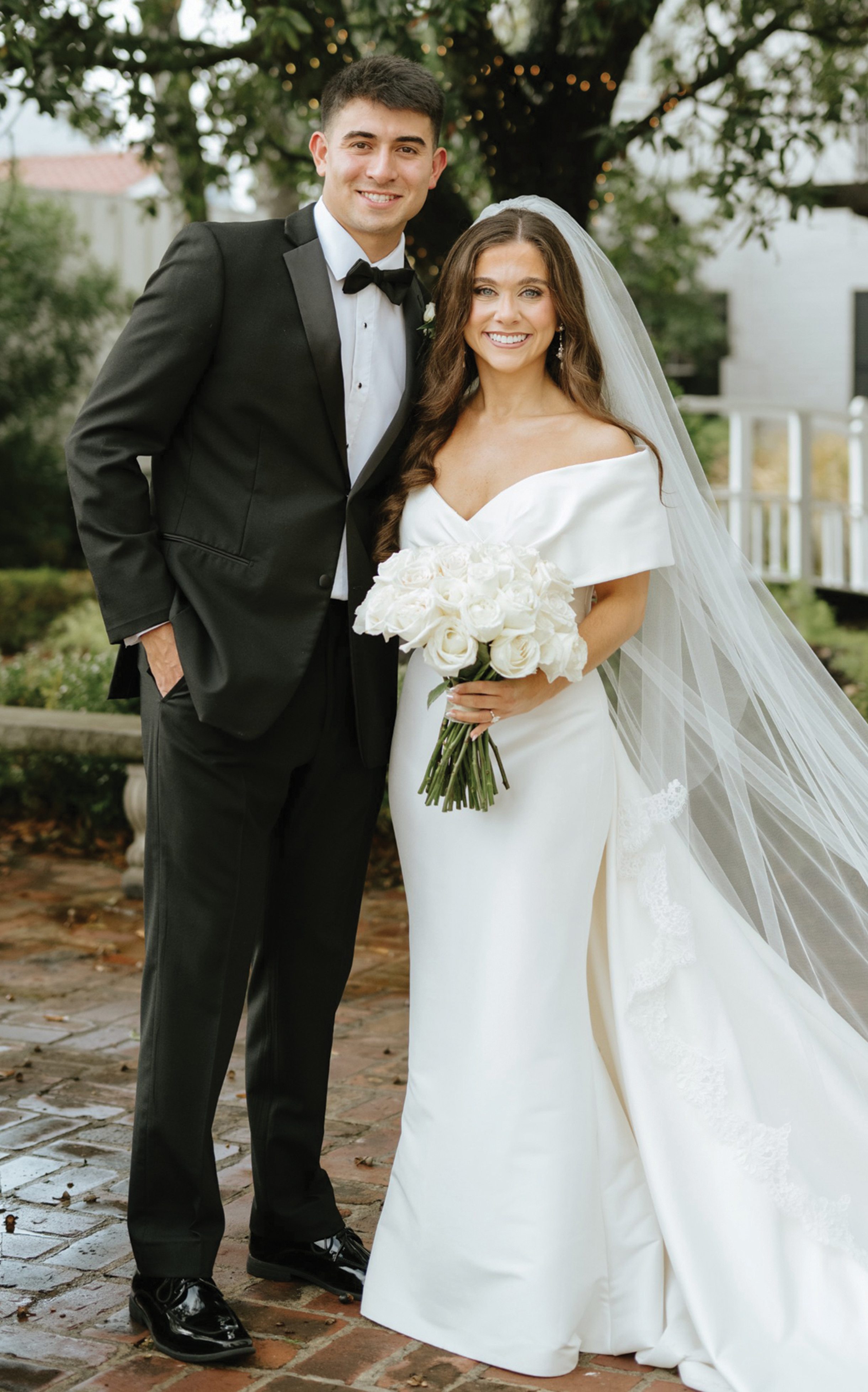 Given in marriage by her parents and escorted by her father, the bride wore a Mikado wedding dress. The fit and flare silhouette featured a wide off the shoulder cuffed neckline. Covered buttons in the back ended with the chapel length train. Completing the ensemble the bride wore a cathedral length designer veil trimmed with lace. She carried a hand tied white bouquet of moundy white playa roses with satin fish tail ribbon.