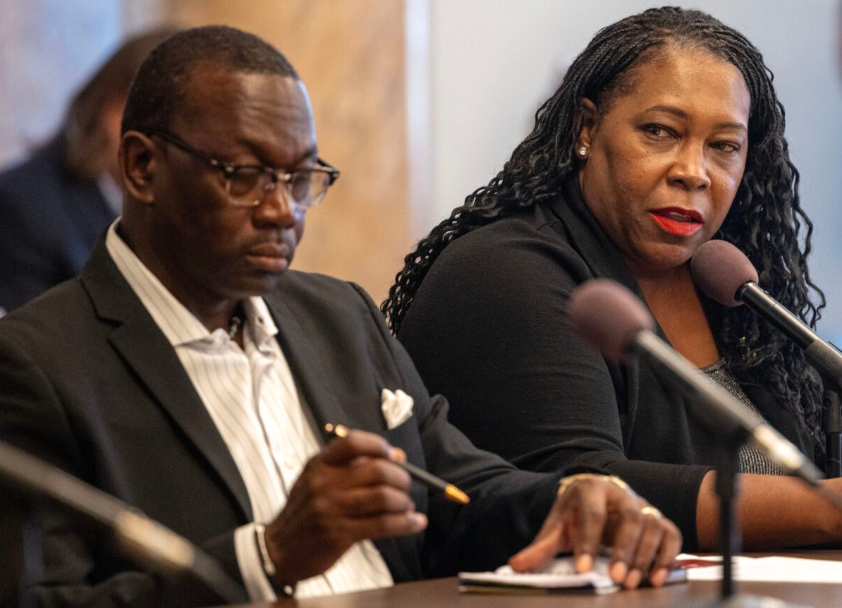 Rep. Kabir Karriem, chairman of Mississippi Legislative Black Caucus, listens to Carol Burnett, executive director of the Mississippi Low-Income Child Care Initiative, during a hearing on how the federal budget bill impacts Mississippi families, Tuesday, Sept. 30, 2025, at the state Capitol in Jackson, Miss. Credit: Eric Shelton/Mississippi Today