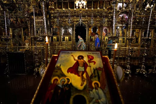 KYKKOS MONASTERY, Cyprus (AP) — Archimandrite Agathonikos bows before the silver-covered icon of the Virgin Mary to offer prayers for an end to the war between “peoples of the same religion” in Ukraine.