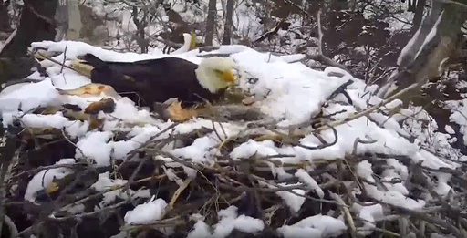 The nature livestream captured the moment the nest fell Sunday morning. A mother eagle crouched in the snow-filled nest as it swayed precariously in the wind. A branch snapped, and the nest collapsed as the mother flew backward. The young eagle was later found dead on the ground, the department said in a statement.