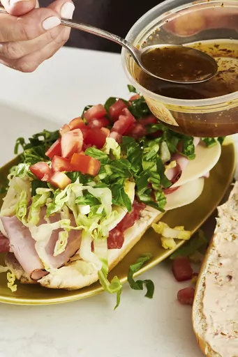Start stacking the sandwich! You can layer up the meats, cheese, vegetables, and condiments any way you like. Save the rest of dressing to drizzle over the top of your sandwich filling before you put the top half of the roll on. Open very wide, and eat!
