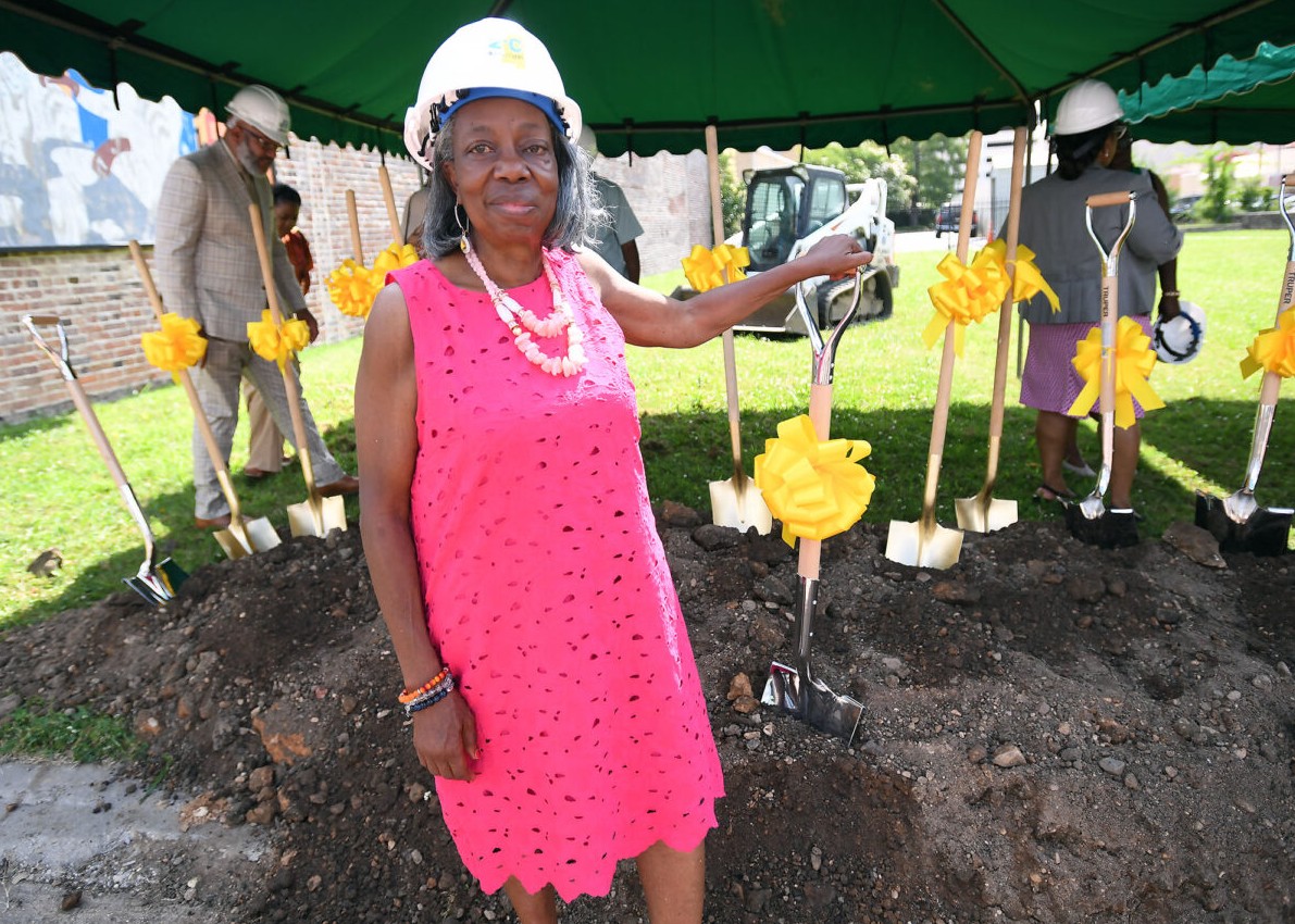 Dorothy Davis, Communities of Shalom executive director (center, in pink), along with other community leaders break ground for the Farish Street Green Commons, Thursday, June 5, 2025 in Jackson, Credit: Vickie D. King/Mississippi Today