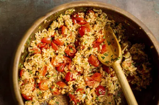 Robust tomato flavor is key to tomato rice, a popular southern Indian dish typically prepared when there is an abundance of ripe, red tomatoes and leftover basmati rice. It’s a versatile but intensely savory dish that can be eaten as a light meal with a dollop of yogurt or paired with seafood, poultry or even a simple fried egg.