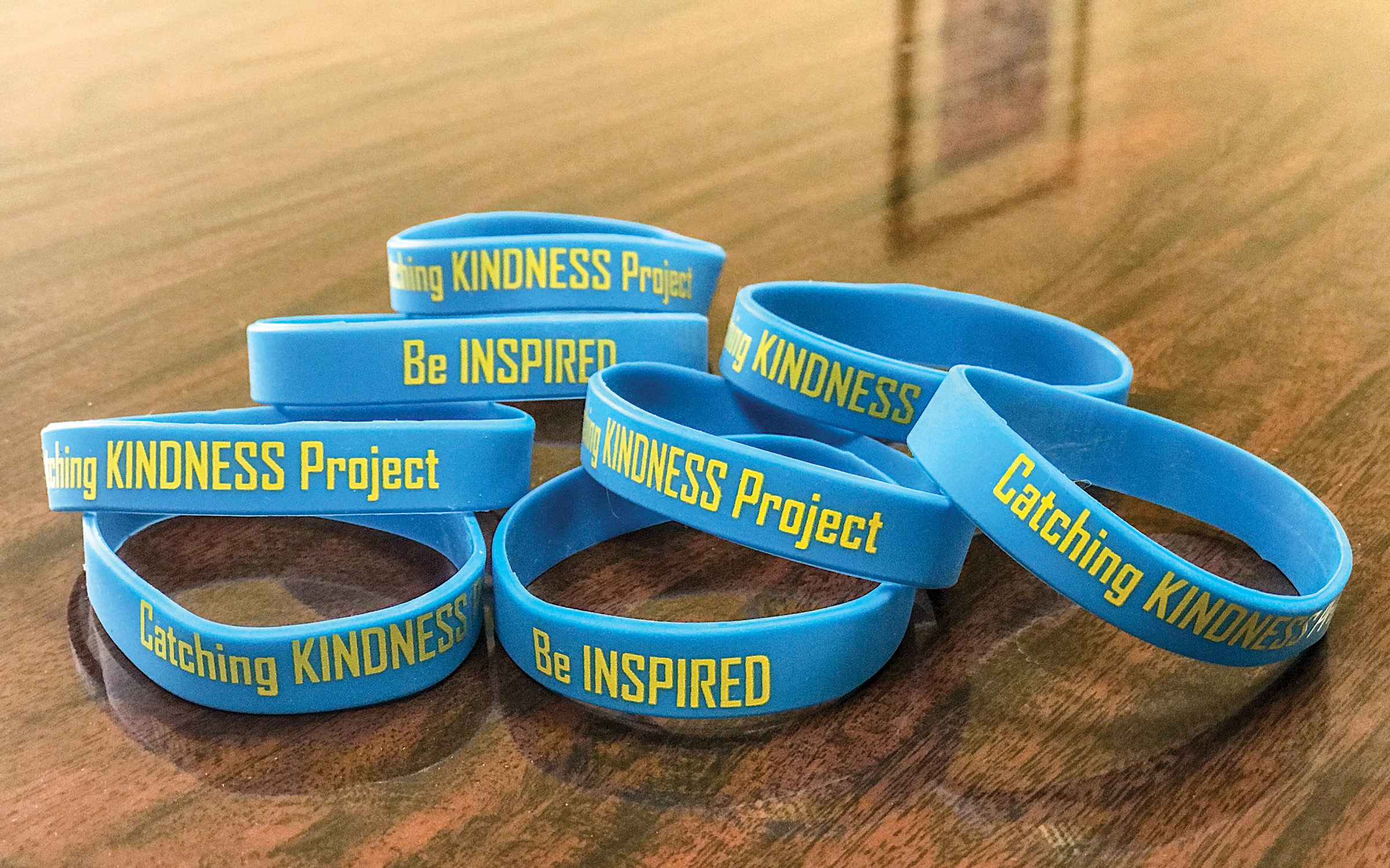 When a kindness ambassador witnesses someone doing something kind, they give the person a bracelet with the words “be inspired” and “Catching Kindness Project” on it and thank them for their kindness.