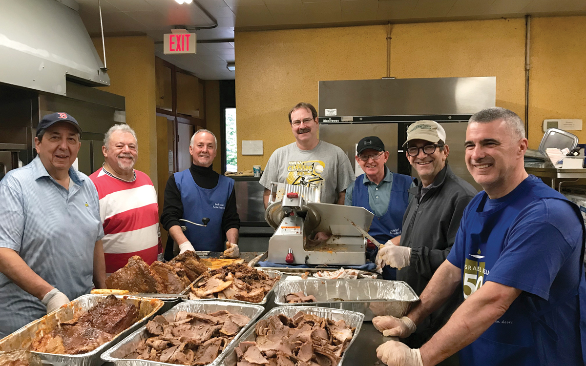 (photo) Jonathan Larkin, Joel Jacobs, Clay Humphrey, Ken Schipper, Peter Sharp, Josh Wiener and Mark Fijman slice and prepare brisket for the upcoming Beth Israel Bazaar