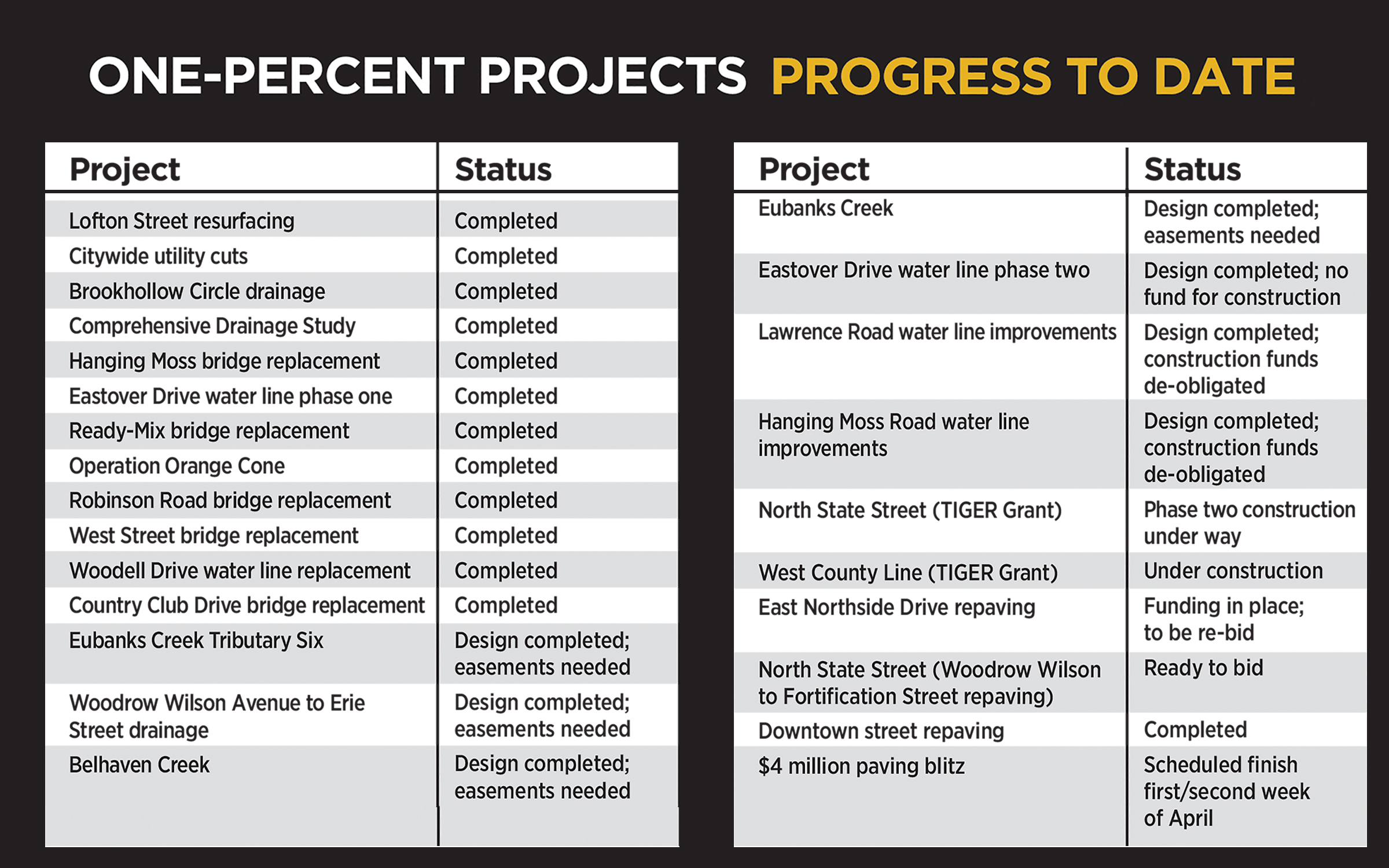 Meanwhile, work continues on the North State Street Reconstruction Project, while repaving projects for another section of North State, East Northside Drive and Woodrow Wilson Avenue are expected to be bid out in a matter of weeks.