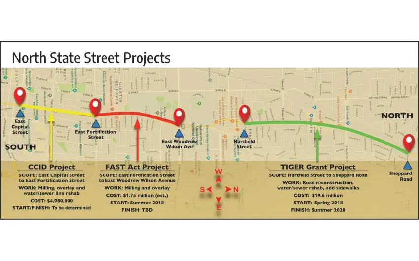 The Mississippi Department of Finance and Administration (DFA) is planning to spend up to $4,980,000 to repair the street from Fortification to Capital. The project is one of eight priorities included in the CCID master plan.