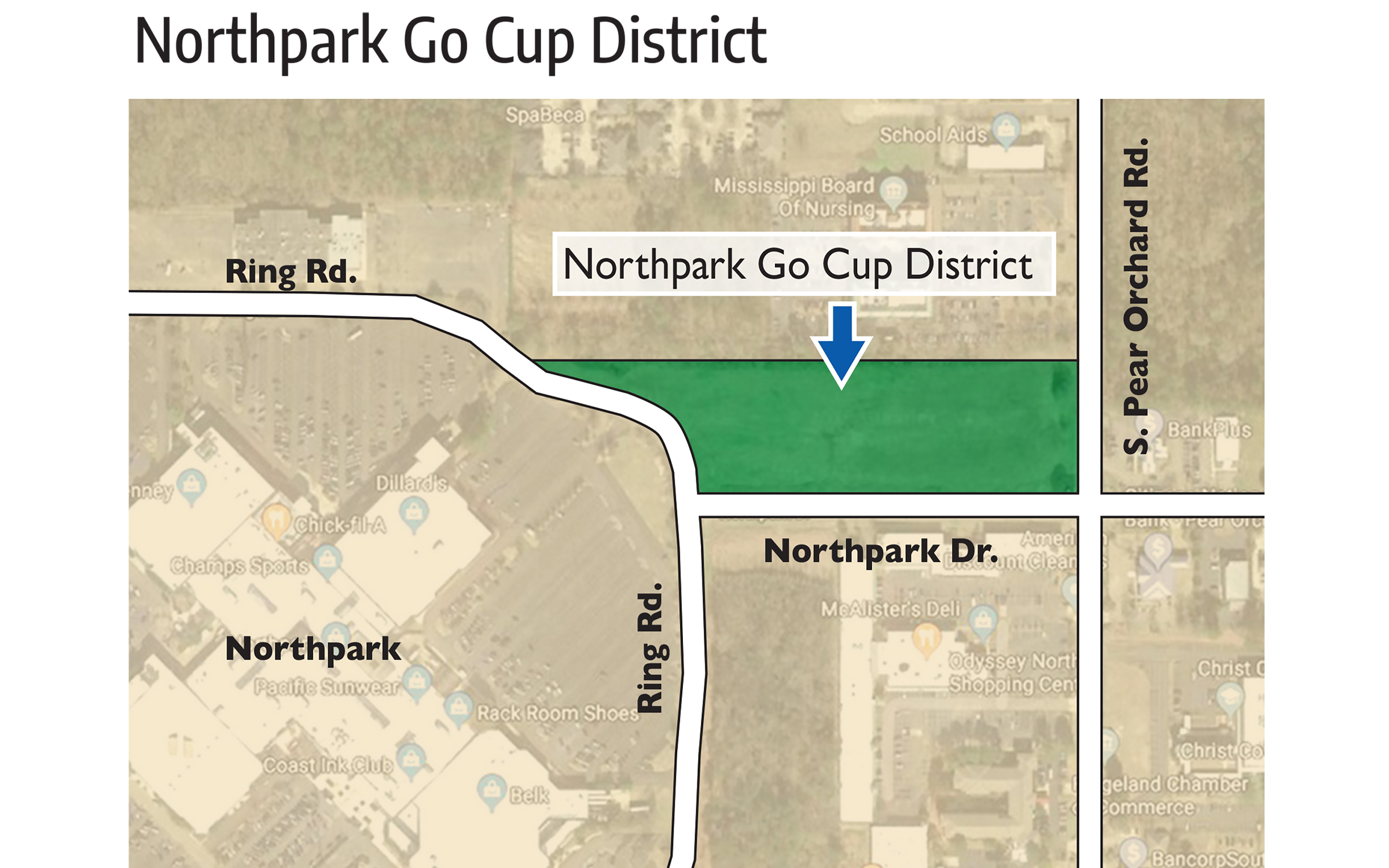 The go cup district will run from the edge of Ring Road near the Dillard’s parking lot, out to Pear Orchard Road, along Northpark Drive.