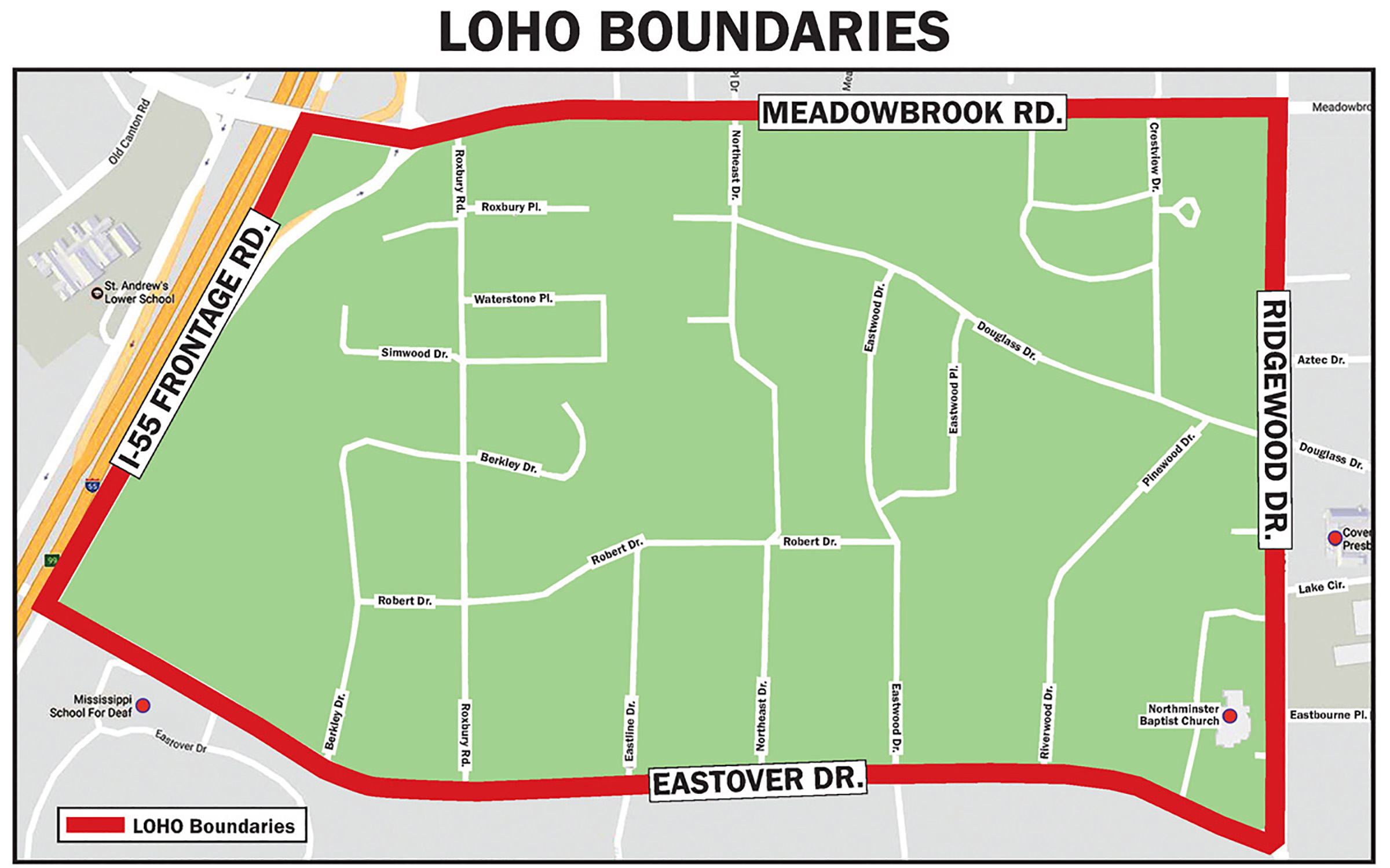 LOHO is bordered by Meadowbrook Road in the north, Eastover Drive in the south, the I-55 North frontage road to the west and Ridgewood Road to the east. The area includes about 240 single-family homes.
