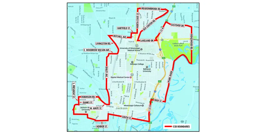 North to south, the CCID runs from Meadowbrook road to Hooker Street and from JSU in the west to the Pearl River and Ridgewood Road in the east.