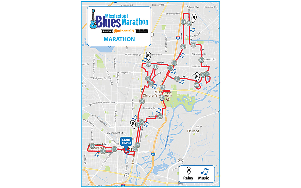 The race begins in front of the Mississippi Arts Center and Russell C. Davis Planetarium on Pascagoula Street and ends in virtually the same spot on Lamar Street.