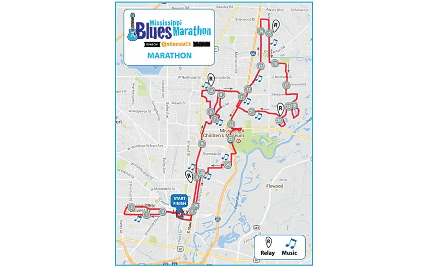The course carries runners past several major city landmarks, including the Old Capitol Museum, the (current) State Capitol building, Jackson State University, Belhaven University, Millsaps College, the Eudora Welty House and the LeFleur Museum District.
