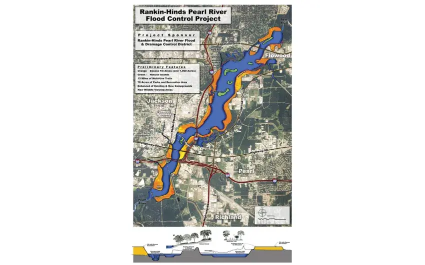 The flood control and economic development project would create a roughly 1,500-acre lake on the Pearl River, running from north of Lakeland Drive to south of I-20 near Richland.