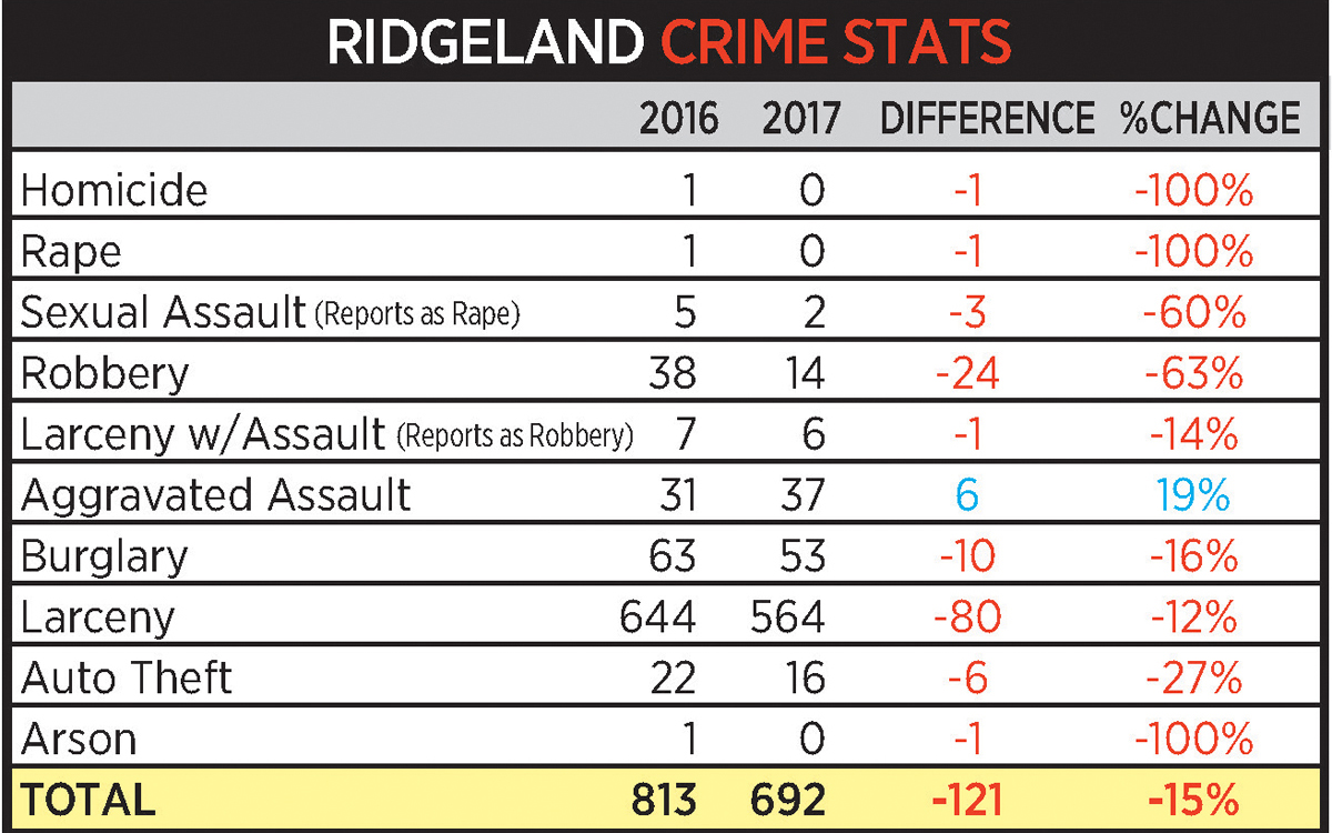 “We had no homicides last year. In 2016, our only homicide was domestic related,” Neal said. “Ridgeland doesn’t have a lot of homicides, so 100 percent increase or decrease isn’t a big deal. But, when you look at higher frequency, higher volume crimes, that’s… good work on the street.”