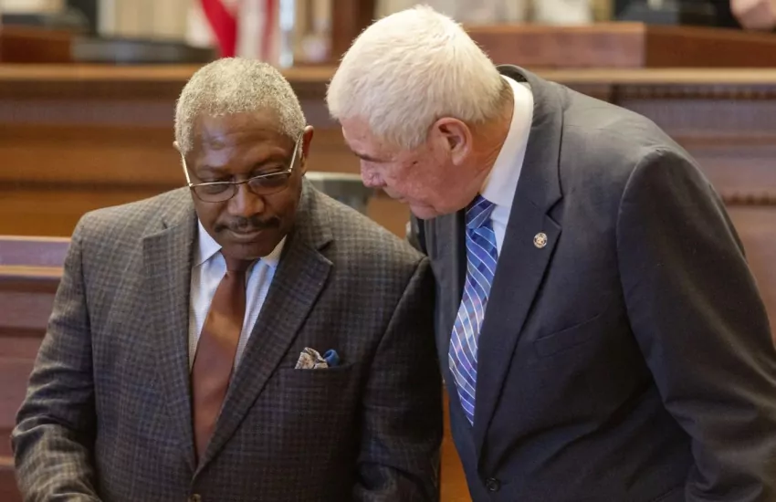 Sen. John Horhn, D-Jackson, left, and Sen. Kevin Blackwell, R-Southaven, speak during legislative session as lawmakers discuss a bill concerning Medicaid expansion at the Capitol in Jackson, Miss., Thursday, March 28, 2024. Credit: Eric J. Shelton/Mississippi Today