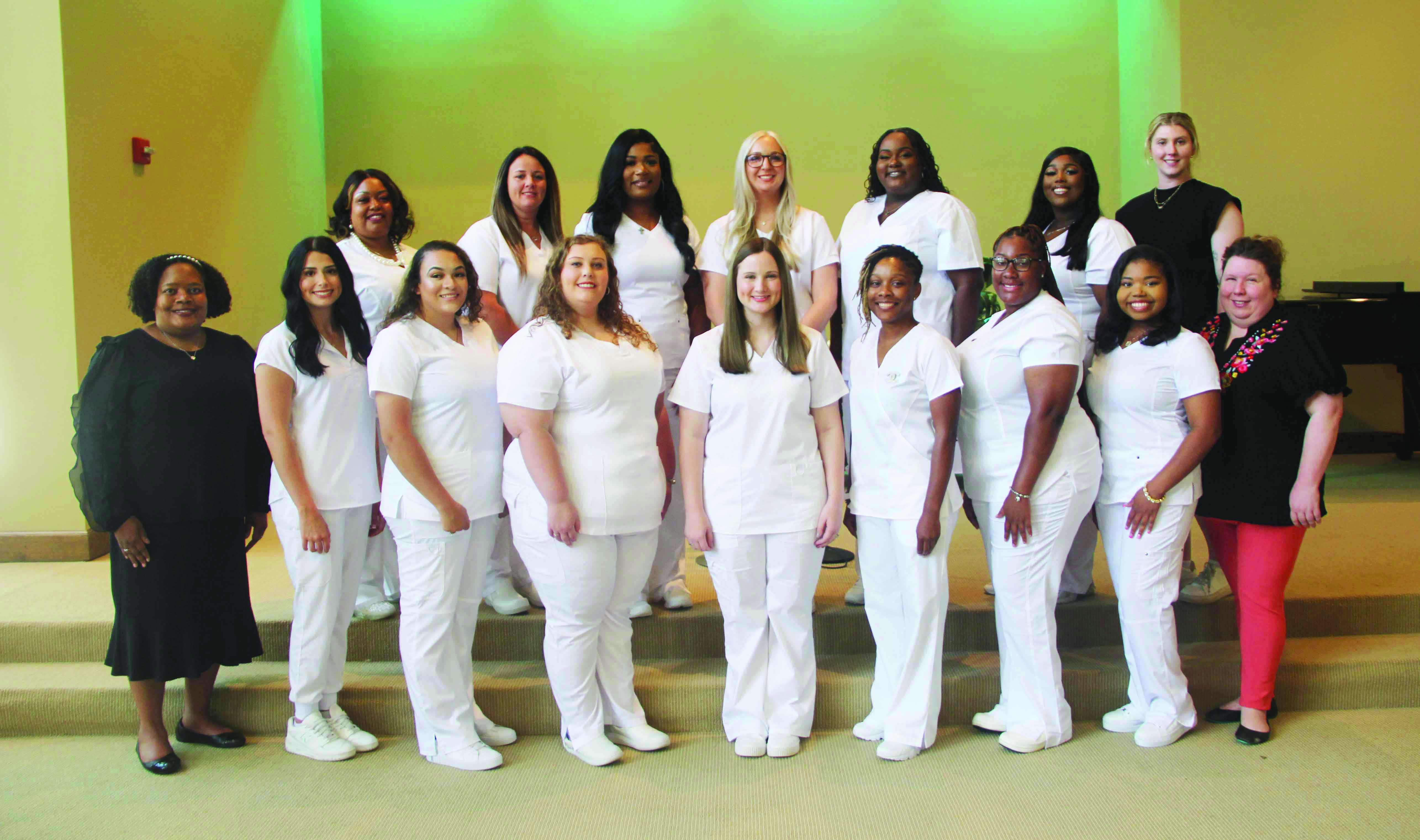 Participating in the Holmes Community College Ridgeland Campus Practical Nursing Class of 2024 are (from left, back) Nikeya Rogers, Megan Brittany Middleton, Kavondra McCauley, Anastasia Kelly, Destiny Janae Malone, I’Leyah Janae Green and Instructor Caley Stogner; and (front) Instructor Dr. Lakesia Sutton, Hannah Alexus Rigby, Jessica Quarles, Sara Kathryn Self, Cortlyn Norris Bardwell, Shae Kelly, Alicia Goldman, Alexandria Cyrus, and Instructor Heather Roberts.