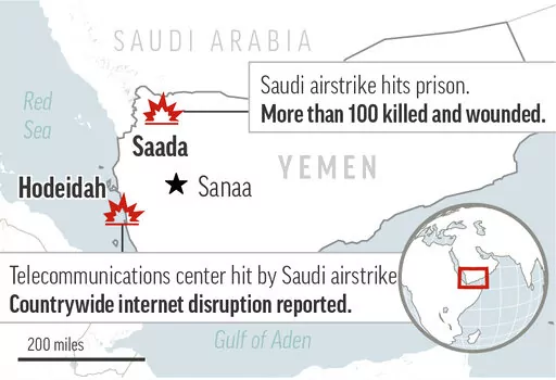 The Saada attack followed another Saudi-led coalition airstrike Friday at the Red Sea port city of Hodeida that hit a telecommunications center key to Yemen’s connection to the internet. Access to the internet has remained “largely down for more than 24 hours” in the country, advocacy group NetBlocks said Saturday.