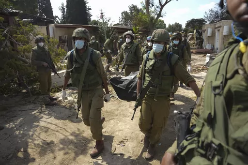 KFAR AZZA, Israel (AP) — On the road approaching this rural village, the bodies of militants lie scattered between the shells of burned-out cars. Walls and doors of what used to be neatly kept stucco homes are blasted wide open. As bags holding the bodies of slain residents await identification, the smell of death hangs thick in the hot afternoon air.