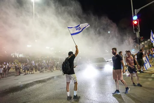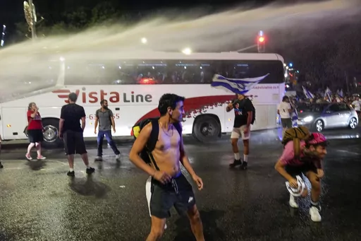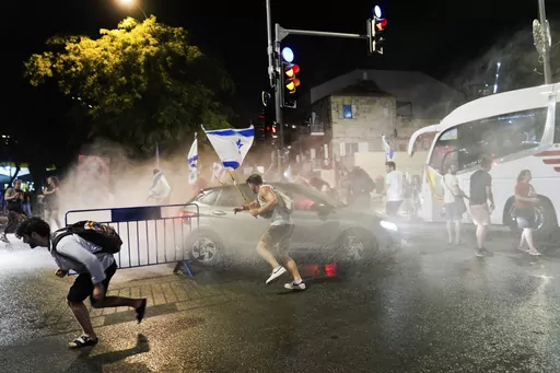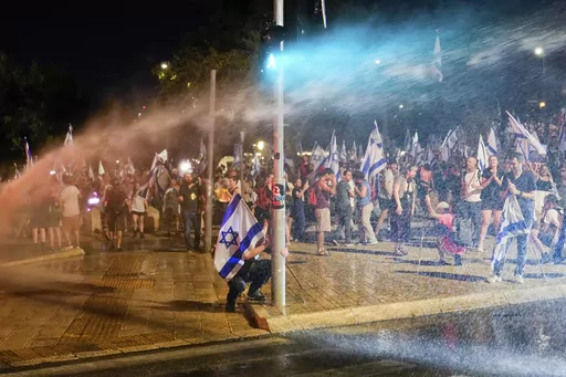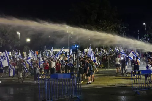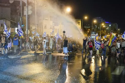 Tensions over the legal plan spiked again late Sunday, as protesters waving Israeli flags blocked roads in Jerusalem, with police using water cannon to disperse them.