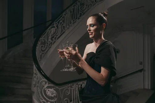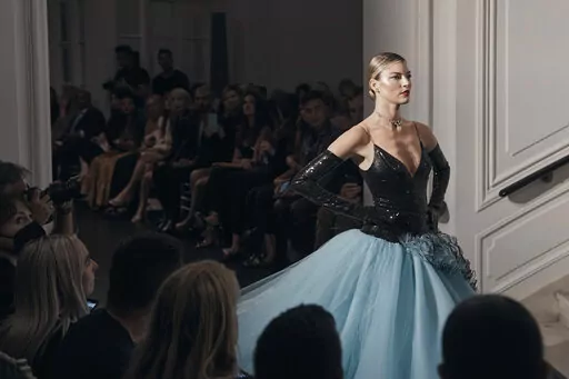Ultra-wide brim hats stole the show in black, royal blue and bright red. There was plenty of sparkle, and an asymmetrical set of huge tiered ruffle bell sleeves on one high-neck evening dress in white. One sleeve started at the shoulder and the other at the elbow.
