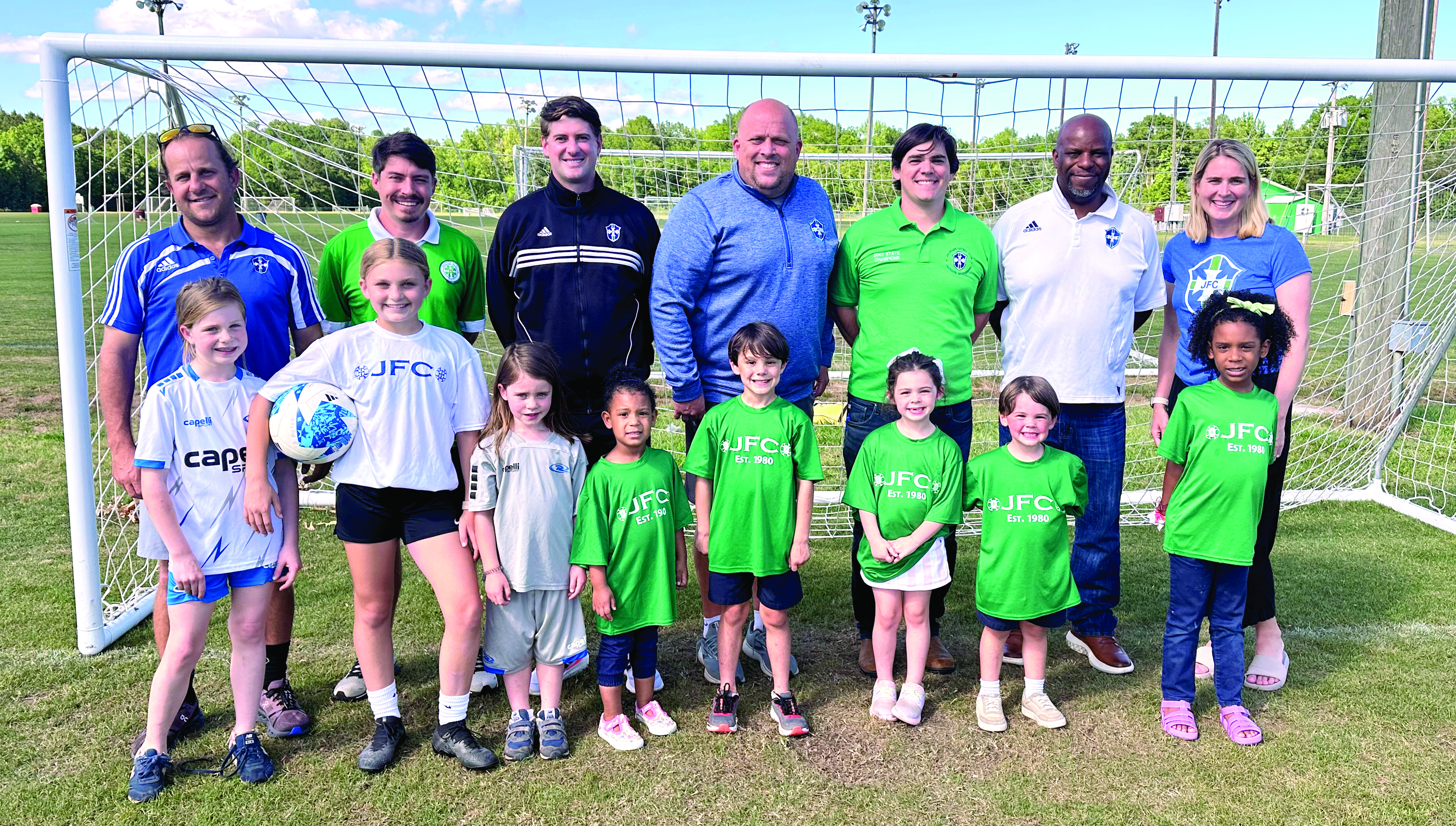 Friends of local soccer club Jackson Futbol Club (JFC) are getting ready for the 16th annual $10,000 Drawdown and silent auction fundraiser at Duling Hall on Saturday, May 11, from 7 p.m. until. Musical guest will be Lazy Lightning. Planning for the event include (from left, back) Sam Peters, Joe Joe Tharp, Craig McCabe, Kevin Johns, Patrick Crews, Jonathan Phillips, Kristen Mallinson; and (front) players Millie Mallinson, Savannah Peters, Emma Mallinson, Magnolia Phillips, Thiel Crews, Townes Crews, Fin Crews and Parker Phillips.