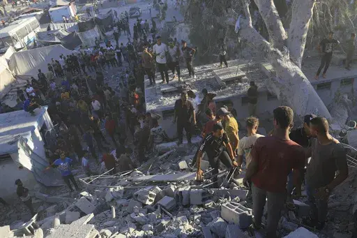 As dust from Wednesday's strike billowed through a street near Nasser Hospital, an Associated Press contributor filmed people running in all directions — some rushing toward the destruction and some away. Men carried two young boys, apparently wounded. Later, civil defense first responders and bystanders picked their way across chunks of cement and twisted metal, searching for people who might have been buried.