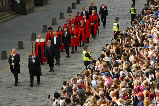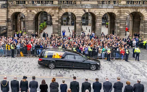 The hearse drove past piles of bouquets and other tributes as it led a seven-car cortege from Balmoral, where the queen died Thursday at age 96, for a six-hour trip through Scottish towns to the palace in Edinburgh. The late queen’s coffin was draped in the Royal Standard for Scotland and topped with a wreath made of flowers from the estate, including sweet peas, one of the queen’s favorites.