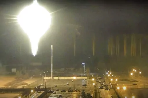 A live-streamed security camera linked from the homepage of the nuclear power plant showed what appeared to be armored vehicles rolling into the facility’s parking lot and shining spotlights on the building where the camera was mounted. There are then what appear to be bright muzzle flashes from vehicles and then nearly simultaneous explosions in the surrounding buildings. Smoke then rises and drifts across the frame.