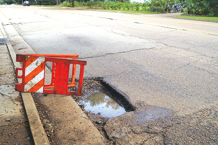 Meadowbrook between Old Canton Road and North State is riddled with potholes and utility cuts, and motorists often have to swerve to miss running into the worst crevasses.