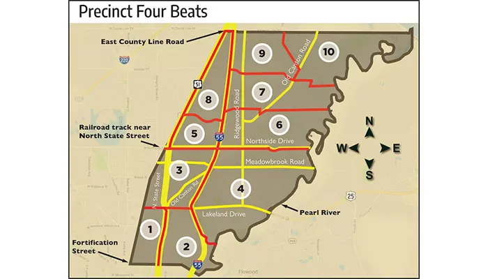 Precinct Four extends from East County Line Road south to Fortification Street and from the Pearl River west to the railroad tracks along North State Street.