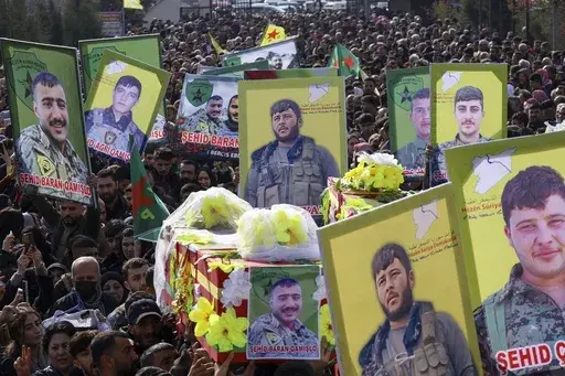 QAMISHLI, Syria — Thousands of people in northeastern Syria attended a funeral Thursday for six fighters from a Kurdish-led, U.S.-backed force who were killed in ongoing clashes with Turkish-backed militias.