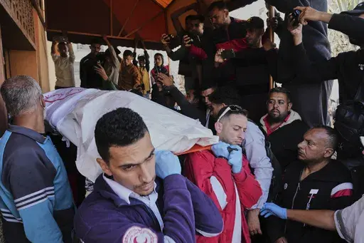 Dozens of people gathered Monday as the bodies of eight Palestinian Red Crescent Society paramedics killed by Israel arrived at Nasser Hospital in southern Gaza. Grieving family members and mourners bid them a final farewell, many overcome with tears.