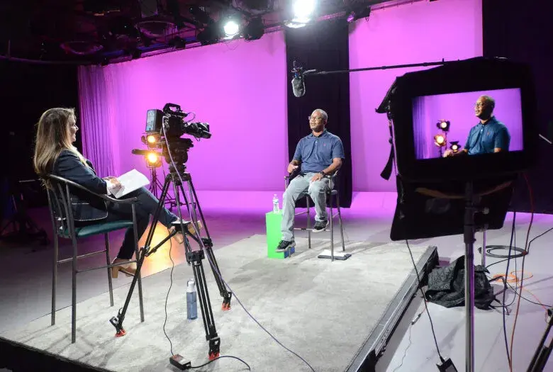 Mississippi Public Broadcasting Chief Operating Officer Anna Neel, left, and Chief Content Officer Taiwo Gaynor chat on set about Gaynor's Medgar Evers documentary at MPB headquarters, Friday, Aug. 1, 2025, in Jackson. Credit: Vickie D. King/Mississippi Today