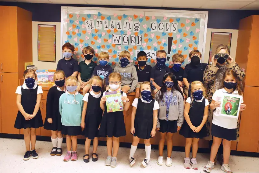 Annie Adjective visited First Presbyterian Day School’s first grade Word Works classes. Shown are (from left, back) Zeke Lowry, William Turnage, Cal Wardlaw, Aden Cannada, Corban Bell, Jack Williams, Will Miley, Matthew Oswalt, Emily Oswalt; (front) Ann Hudson Vines, Frances May, Conley Mae Benson, Primm Strickland, Emery Stansell, Anna Kathryn Hinshaw, Gaby Marin, Riley Reed McDavid…