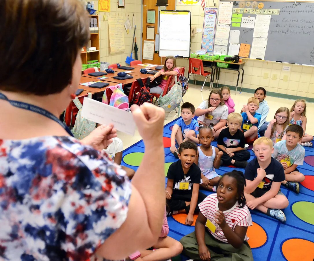 Pelahatchie Elementary School second grade teacher Sharon Hall and her students engage in a learning program called Eureka Math² at the school, Friday, Aug. 9, 2024. The program helps students visualize mathematics using hands-on tools. Credit: Vickie D. King/Mississippi Today