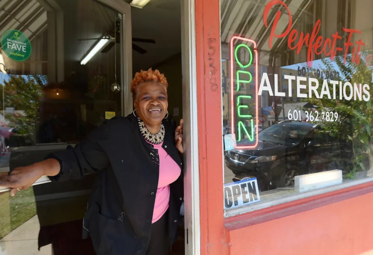 “I’ve known him since he was a med student. Now his kids are doctors,” said Perfect-Fit Alterations owner Annette Olowo-Ake of long-time friend Dr. Jim Aron, a 30-plus year customer, Thursday, Oct. 10, 2024. Credit: Vickie D. King/Mississippi Today