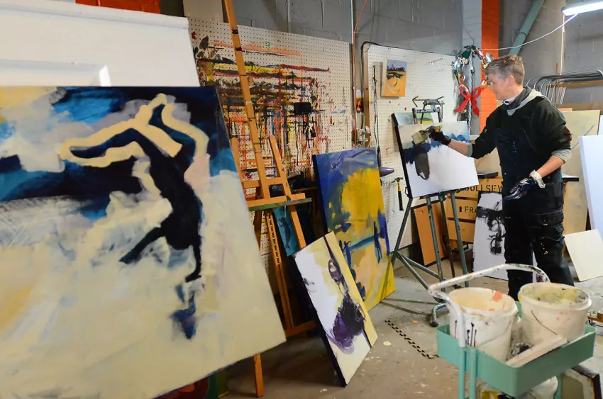 There’s a preciseness to artist Ellen Langford’s movements as she works on multiple projects in the workplace studio she shares with other artists.