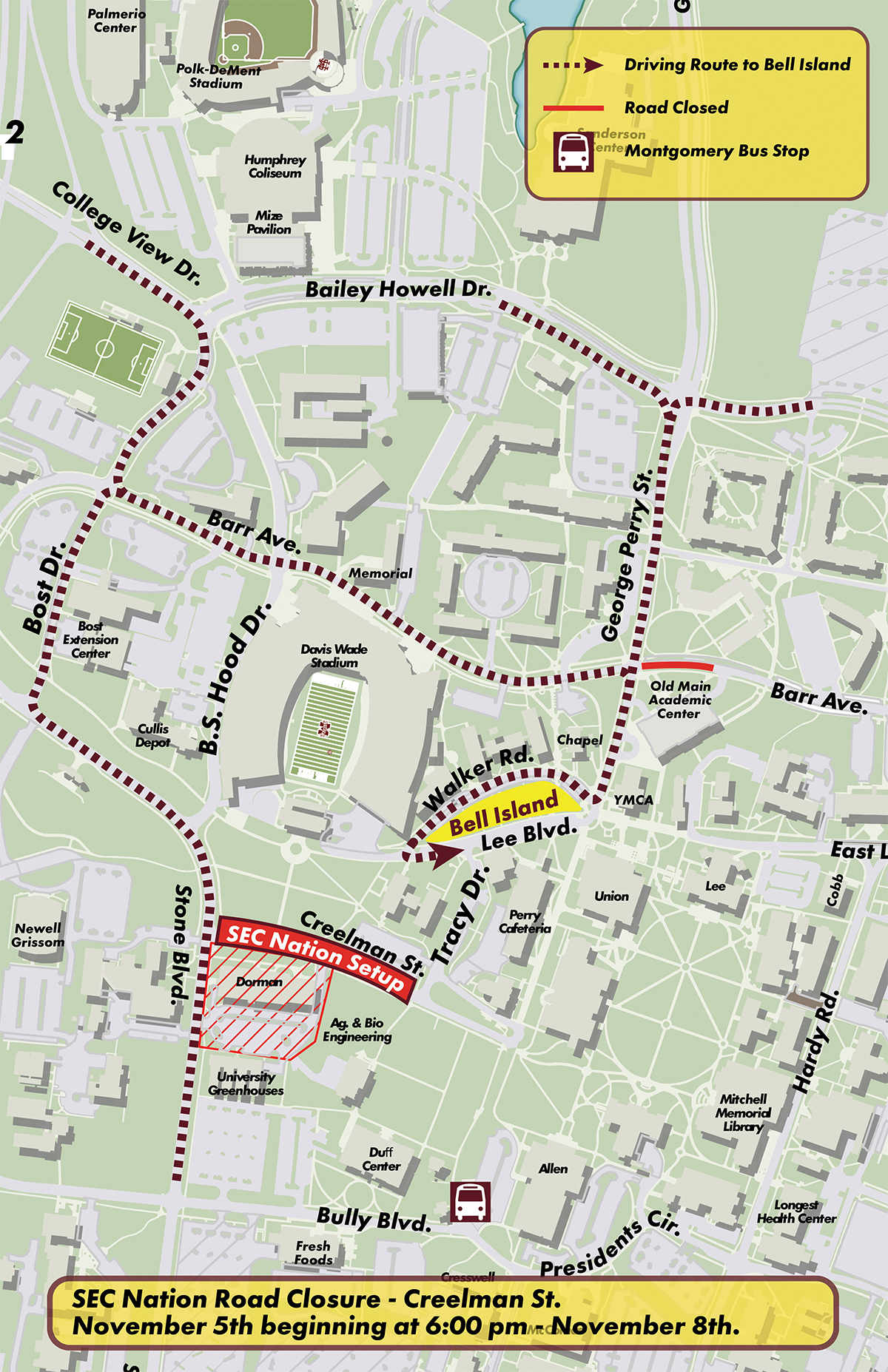 All traffic accessing the Bell Island area must use George Perry Street from the north. On George Perry Street, fans continue past Old Main Academic Center and the Chapel of Memories to access Bell Island.