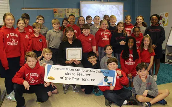 St. Richard Catholic School fourth grade teacher Ann Campbell was recently awarded “Top 12 Metro Teacher of the Year” by the Greater Jackson Chamber. The teachers were selected from all public, private, and parochial schools in Hinds, Madison, and Rankin counties. Mrs. Campbell teaches fourth grade students. Students celebrating with her are (from left, back), (from left, back) Loftis Garner, James Proctor-Dickson, Clara Clifford, Olivia Weisenberger, James Harrison, Jacob Schermann, Nicolas McLaurin, George Decker, Susie Steckler, Maley Thornhill, Erin Wynter; (middle) Cheney Neel, Lily Frances Garner, Neel Boteler, Walt Hammond, Mrs. Ann Campbell, Vinny Milton, Noah Moore, Mary Ellen Curley, Mayce Laird, Zuri Hays; (front) Jake Garrison, Eli Watkins, Jacob Gomez, Ben Manhein, Robby Byrd, Chaiya Turner, John Brody Fournet and Addson Perkins.