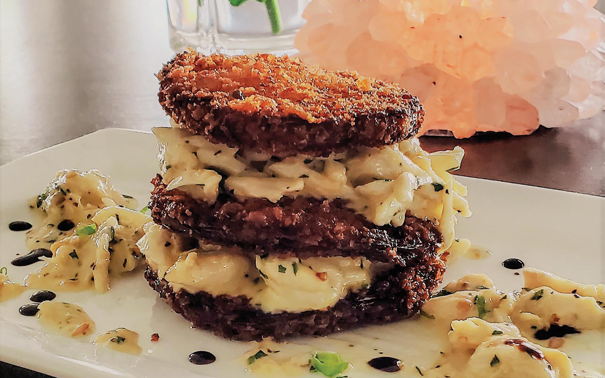 Fried green tomatoes with lump crab, sherry, and cream
