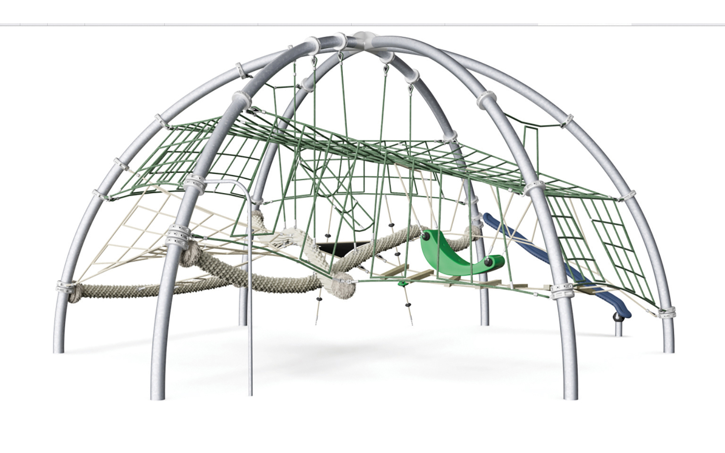 One structure includes what looks like the framing of a classic jungle gym, but instead of monkey bars, it has numerous ropes, ladders and other devices for climbing.