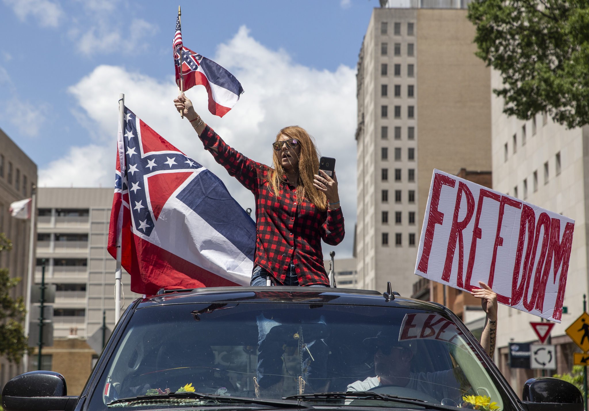 A protester holds a Stennis Flag, which is the proposed design of the new Mississippi state flag, during the Black Lives Matter protest in downtown Jackson, Miss., Saturday, June 6, 2020.