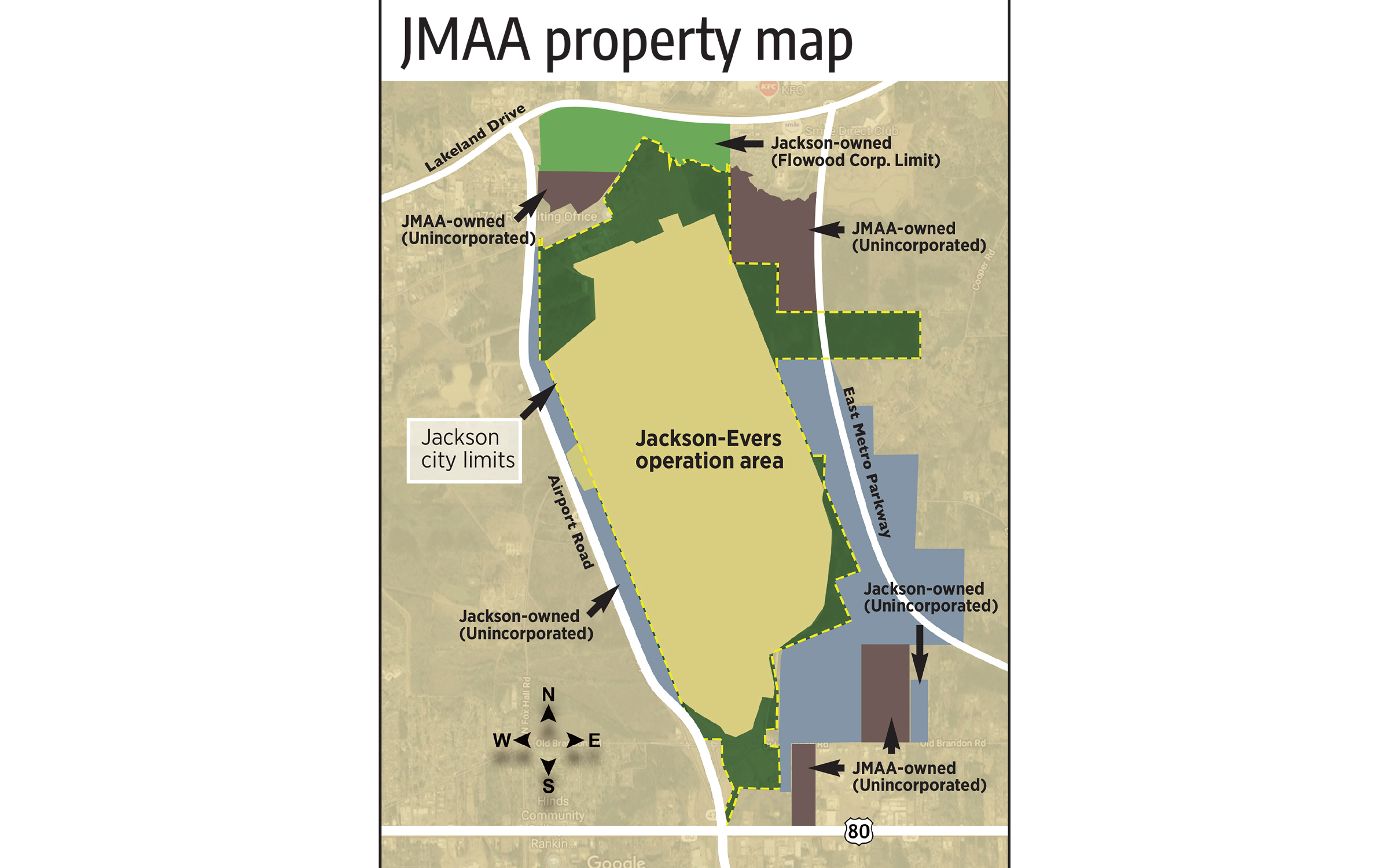 The land in question surrounds the Jackson-Evers airport which sits on approximately 3,700 acres of land in Rankin County. The property is bordered by Lakeland Drive to the north and Airport Road to the east. To the west, city-owned property is located on both sides of the recently completed East Metro Parkway. All 3,700 acres are owned either by the city of Jackson or the Jackson Municipal Airport Authority (JMAA), a Jackson city agency.